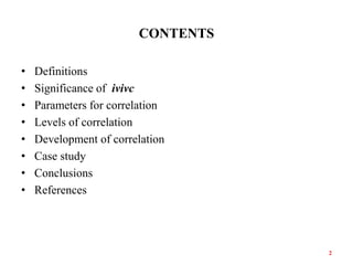 This document discusses in vitro-in vivo correlations (IVIVCs). It defines IVIVC as a predictive mathematical model relating an in vitro property (e.g. dissolution rate) to an in vivo response (e.g. absorption rate). The document outlines the significance of IVIVCs in reducing bioequivalence studies and supporting biowaivers. It describes different levels of IVIVC (A, B, C) and parameters that can be correlated (dissolution rate to absorption rate; percent dissolved to percent absorbed). The document provides examples of IVIVC case studies and concludes that current regulatory guidelines only apply to oral dosage forms, while further research is needed to develop IVIVCs for other drug products.