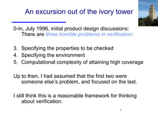 The document discusses three major problems in verification: specifying properties to check, specifying the environment, and computational complexity. It then presents several approaches to addressing these problems, including using coverage metrics tailored to detection ability, sequential equivalence checking to avoid testbenches, and "perspective-based verification" using minimal abstract models focused on specific property classes. This allows verification earlier in design when changes are more tractable and catches bugs before implementation.