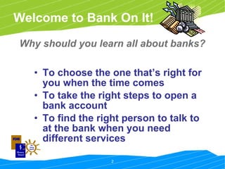 Banks offer services like deposit and loan accounts to safely store money. Some key reasons to use a bank include safety, convenience, lower costs, and building your financial future. To open an account, you will need to visit a bank, show ID, fill out paperwork, and make an initial deposit. Different bank employees, like tellers and loan officers, provide various services. It's important to protect your personal information from identity theft.