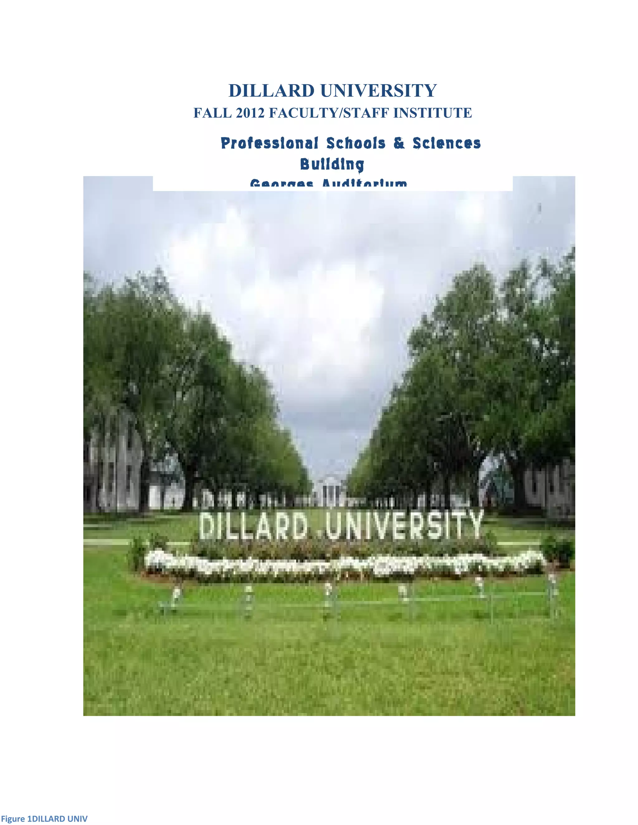 This document outlines the schedule and topics for Dillard University's 2012 Fall Faculty/Staff Institute. The institute runs from August 14-17 and covers professional development, technology training, university policies and initiatives. On the first day, faculty will learn about the Quality Enhancement Plan and complete LiveText training. Subsequent days include presentations on academic affairs, student success programs, and grantsmanship. Time is also allotted for department, college and divisional meetings.