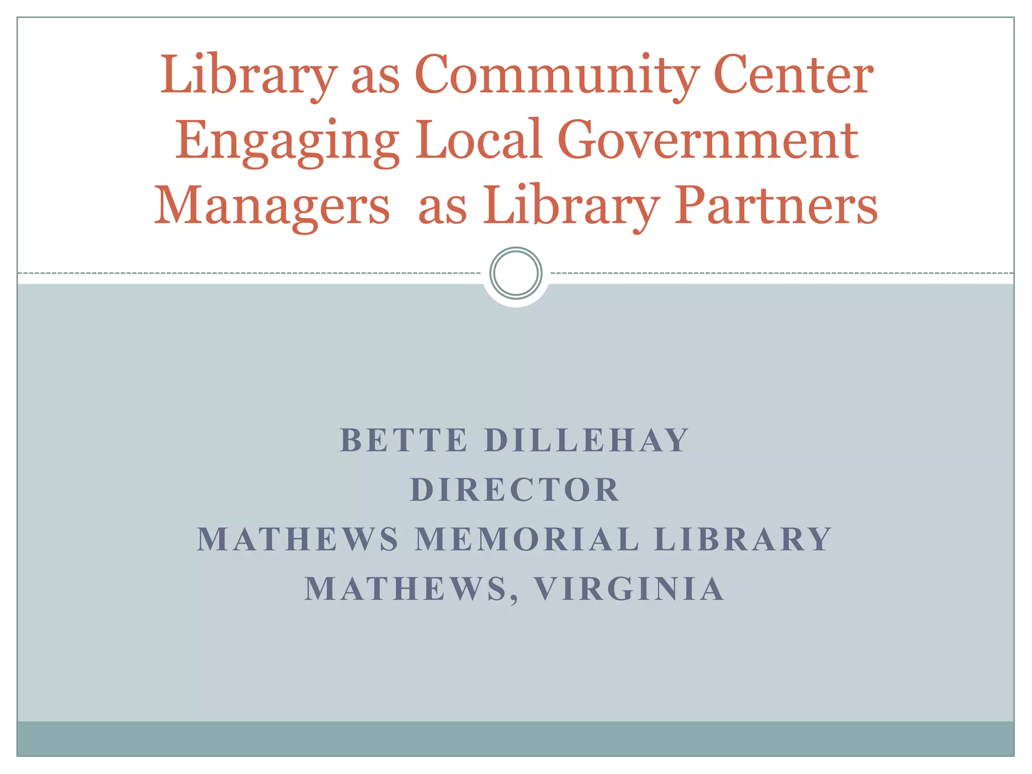 Bette Dillehay, Director of Mathews Memorial Library in Mathews, Virginia, presented on engaging local government managers as library partners. She provided background on Mathews County, which has a population of 9,200 and is known as a popular retirement destination. Her presentation discussed how local government managers can use libraries to achieve community priorities through joint strategic planning and ensuring library missions align with community goals. She also outlined various governance models, library assets, service roles, and steps libraries can take to become more engaged in their communities.