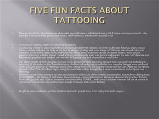 Tattoos contain permanent color particles with metal salts, plastic and chemicals rather than natural vegetable colors. Tattooing developed in many cultures as a way to mark the skin through various techniques like pricking, puncturing or tapping pigment into the skin. Evidence of some of the earliest tattoos date back to around 3300 BC on the Iceman mummy, though Egyptian and Nubian mummies from around 2000 BC also contained tattoos.