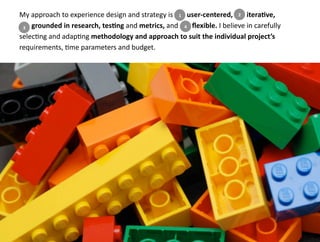 The document provides details about Dima Todorova Lilavois' experience and approach to experience design and strategy. It includes her contact information and summaries of various projects she has worked on, including: