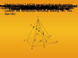 Dokumen ini menjelaskan langkah-langkah menggambar limas dan titik-titik perpotongan garis dalam ruang tiga dimensi. Beberapa titik yang penting seperti x, y, dan z diidentifikasi sebagai titik tembus dari garis ke bidang tertentu. Proses ini mencakup penarikan garis dari titik-titik tertentu dan penamaan titik perpotongan.