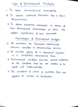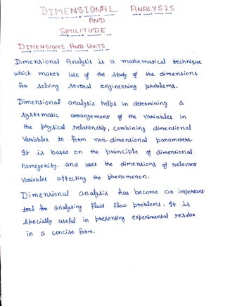 Dimensional analysis and similitude are mathematical techniques that use the study of dimensions and units to help solve engineering problems. Dimensional analysis is based on the principle of dimensional homogeneity and examines the dimensions of relevant variables affecting a phenomenon. It helps determine the systematic arrangement of variables in a physical relationship. Dimensional analysis has become important for analyzing fluid mechanics problems. It is especially useful for presenting experimental results in a concise form. Dimensional analysis ensures dimensional homogeneity. It is used to formulate equations and derive relationships between phenomena. Dimensional analysis can be used to derive equations expressed in terms of non-dimensional parameters to show the relative significance of each parameter.