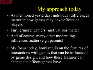 The document discusses Douglas Gentile's dimensional approach to understanding the effects of video games. It outlines five dimensions - amount, content, structure, context and mechanics - that can influence the effects games have on players. Gentile provides several examples of studies that show effects related to specific dimensions, such as improved attention and cognition from games with certain structural elements. The approach aims to move beyond simplistic views of games as entirely good or bad and provide a framework for understanding different levels of effects.