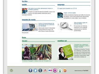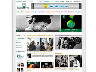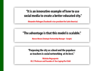 This document discusses an innovative education initiative called Learning Neighborhood that maps the assets of a neighborhood and turns the entire community into a classroom to create connections between sectors. It aims to turn around schools the government had decided to shut down. It also discusses Catraca Livre, an information hub that selects and delivers information on free and low-cost opportunities in the city via various media channels like radio, newspapers, displays on buses and subways.
