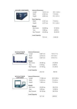 This document provides specifications for various types of shipping containers, including their internal dimensions, door openings, weight limits, and load capacities. It includes specifications for 20-foot and 40-foot dry containers, flat rack containers, open top containers, refrigerated containers, and 40-foot high cube refrigerated containers. The dimensions are given in both metric and imperial units, and the weight limits and capacities are provided in both kilograms/metric tons and pounds.
