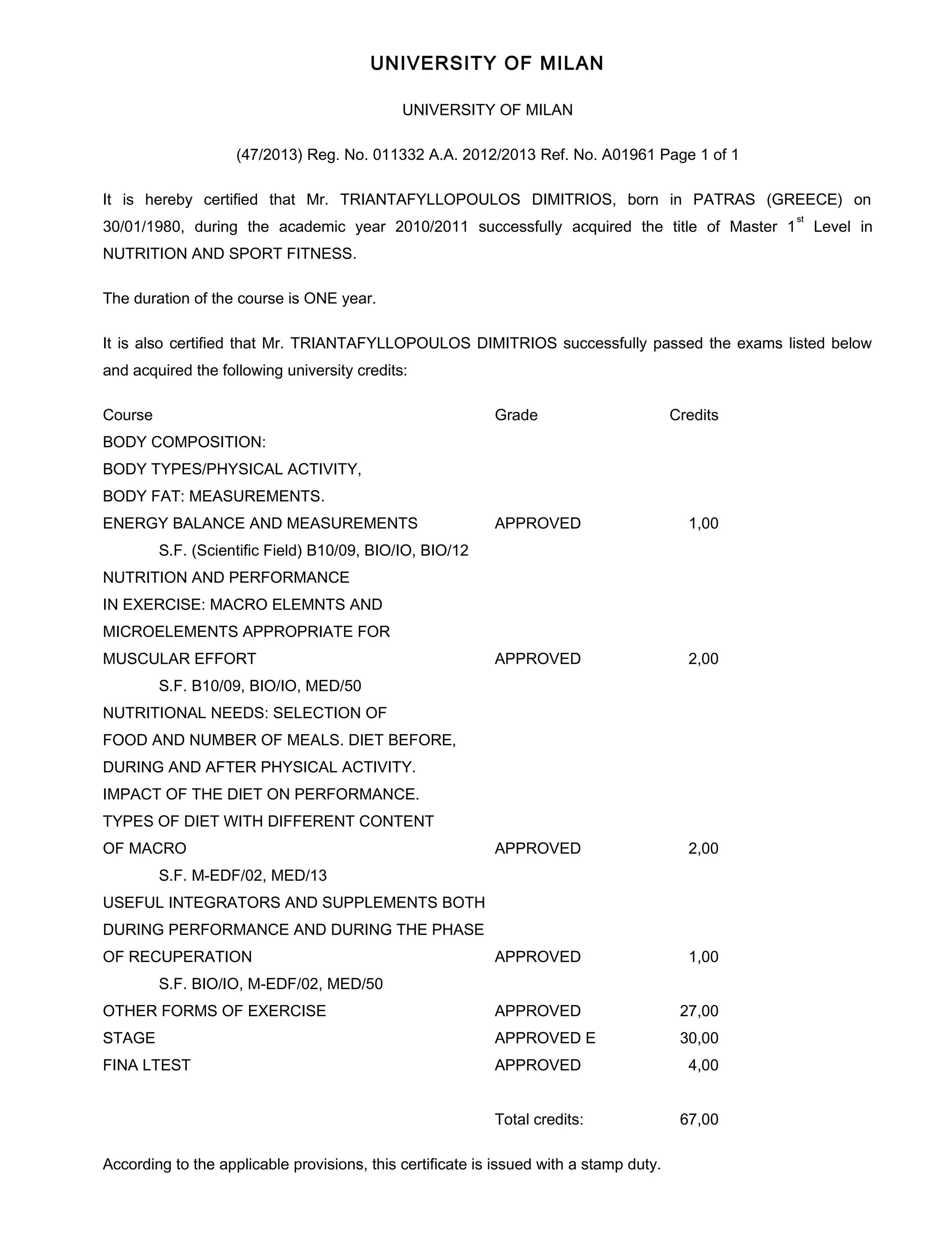 Mr. Dimitrios Triantafyllopoulos earned a Master's degree in Nutrition and Sport Fitness from the University of Milan in 2010-2011. He successfully completed courses in body composition, nutrition for exercise, dietary needs, supplements, and other forms of exercise. Mr. Triantafyllopoulos also earned a degree in Motor Sciences with a focus on event and activity management from the University of Urbino "Carlo Bo" in 2006, having studied there from 1999-2005.