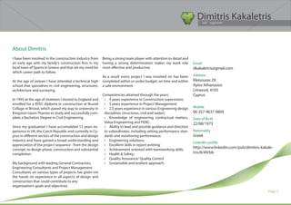 Dimitris Kakaletris is a civil engineer with over 12 years of experience in the UK, Czech Republic, and Cyprus. He has worked on various construction projects specializing in areas like project management, site supervision, design, and health and safety coordination. Currently he works as a contract engineer for MWH Global in Cyprus, supervising a sewerage project.