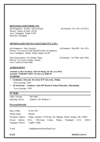 Dimple Rana is seeking a challenging position in FMCG to utilize her 9+ years of experience in institution sales and distribution channel management. She currently works as an Area Sales Manager for Drums FoodInternational, managing sales in Chandigarh, Punjab, and Jammu & Kashmir. Previously she held sales roles at Indagro Food’s, Britannia Industries, and Mother Dairy, where she was awarded "Best Territory Sales In-charge" and "Golden Boy". She has a Bachelor's degree from HP University and skills in MS Office and Windows operating systems.