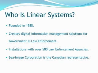 DIMS is a digital information management system created by Linear Systems for law enforcement agencies. It manages digital evidence and ensures compliance with standards. DIMS reduces liability by securely storing evidence and making it easily accessible. It also increases efficiency by automating workflows like chain of custody processing. The system has comprehensive tracking of information, incidents, and evidence handling. Additional modules integrate technologies like in-car video, interview room audio/video, and AFIS.