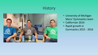 Mate Bros is a sports energy drink company founded by former University of Michigan gymnasts in 2014. They have raised $300,000 from strategic investors and are pursuing retail partnerships. Their secret sauce is an all-natural energy drink formulated for gymnasts using only 5 ingredients that boosts energy without a crash. While Gatorade and Powerade dominate the market, Mate Bros sees opportunity as a natural alternative focused on performance.