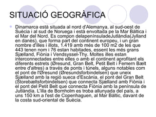 SITUACIÓ GEOGRÀFICA Dinamarcaestà situada al nord d'Alemanya, al sud-oest de Suècia i al sud de Noruega i està envoltada pe la Mar Bàltica i el Mar del Nord. Es compon delapenínsuladeJutlàndia(Jylland en danès), que forma part del continent europeu, i un gran nombre d'illes i illots, 1.419 amb més de 100 m2 de les que 443 tenen nom i 76 estan habitades, essent les més grans Sjælland, Fiònia i Vendsyssel-Thy. Moltes illes estan interconnectades entre elles o amb el continent aprofitant els diferents estrets (Øresund, Gran Belt, Petit Belt i Femern Bælt entre d'altres) a través de ponts i túnels, alguns notables com el pont de l'Øresund (Øresundsforbindelsen) que uneix Sjælland amb la regió sueca d'Escània, el pont del Gran Belt (Storebæltsforbindelsen) que connecta Sjælland amb Fiònia i el pont del Petit Belt que connecta Fiònia amb la península de Jutlàndia. L'illa de Bornholm es troba allunyada del país, a uns 150 km a l'est de Copenhaguen, al Mar Bàltic, davant de la costa sud-oriental de Suècia.