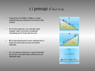 El principi d’inèrcia. Experiment de Galileo: Galileo va idear experiències per estudiar el moviment dels cossos. A : la bola adquireix una velocitat cada vegada major (moviment accelerat) impulsada per la força del seu pes. B : la bola disminueix la seva velocitat fins a parar-se induït pel seu pes (moviment retardat). C : si la deixem rodar per un pla horitzontal i llis, el seu moviment seria uniforme (no es detindria mai).