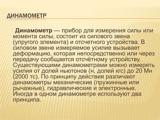 Динамометр — это прибор для измерения силы или момента силы, который состоит из упругого элемента и отсчетного устройства, позволяющий измерять усилия от долей ньютонов до 20 Мн. Существуют различные типы динамометров: механические, гидравлические и электронные, каждый из которых работает по своим принципам. Приборы широко используются в повседневной жизни для контроля силы в различных системах, чтобы предотвратить травмы.