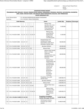 Dokumen tersebut berisi penjabaran anggaran belanja Dinas Pendidikan Kabupaten Pakpak Bharat untuk tahun anggaran 2021. Terdapat penjelasan mengenai program-program yang mencakup pendidikan dasar, menengah pertama, serta sarana dan prasarana pendidikan seperti pembangunan gedung sekolah.