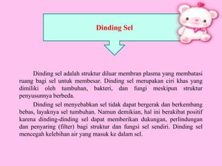 Dinding sel tumbuhan berfungsi untuk mempertahankan bentuk sel, memberi kekuatan mekanik, dan memberi perlindungan. Dinding sel terdiri atas lapisan yang berbeda seperti lapisan tengah kaya pektin, dinding sel primer tipis dan fleksibel, serta dinding sel sekunder tebal yang mengandung lebih banyak selulosa dan lignin. Komposisi dinding sel meliputi karbohidrat seperti selulosa, hemiselulosa, dan pektin serta lignin yang