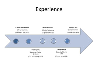Dinesh Dhamija has over 20 years of experience as a software developer and application architect. He has worked in roles leading development teams at companies such as Expedia, BestBuy, and T-Mobile. Dinesh has expertise in web development, databases, architecture, and leadership. His technical skills include languages like Java, C#, and technologies like SQL Server, Hadoop, and ASP.Net.