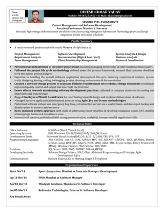 Dinesh Kumar Yadav is a senior level IT professional with nearly 9 years of experience in project management, software development, system analysis and design. He has extensive expertise in the full software development lifecycle from requirements analysis to testing and documentation. Some of his roles have included managing project teams, ensuring deadlines are met, and driving software development practices and quality control. He is proficient in technologies such as C#, ASP.NET, SQL Server, and Agile methodologies. His experience spans a variety of projects for clients in banking, insurance, and sports media.
