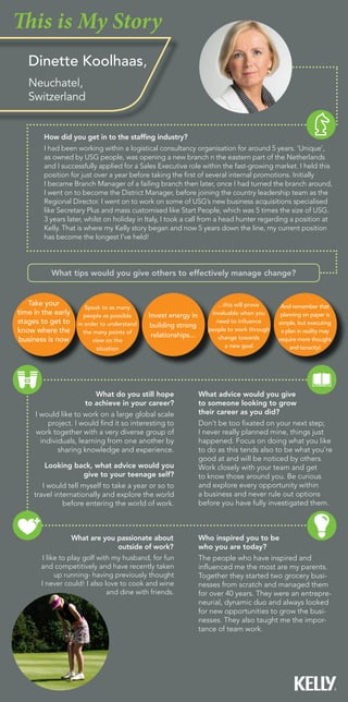 The document discusses the career and advice of an individual who has worked in staffing and managing change. They advise to not be too fixated on the next step and instead focus on doing what you enjoy and getting to know your team. They also suggest taking time early on to understand different perspectives within a business before executing plans for change. Their passion outside of work includes golf, running, cooking, and spending time with friends.