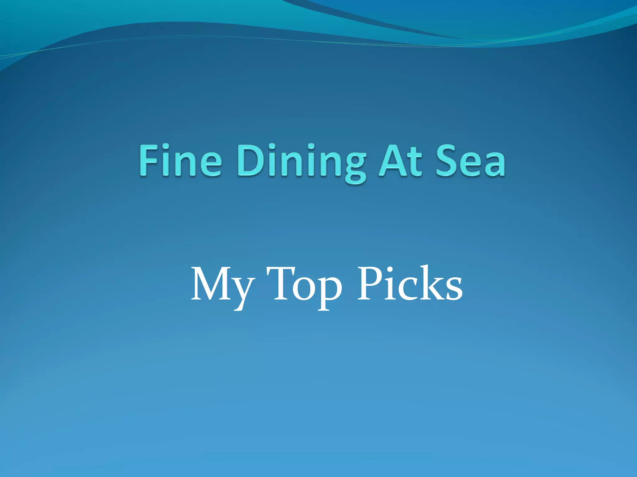 The document discusses and recommends the author's top restaurant picks on various cruise ships. It summarizes Todd English's restaurant on the Queen Mary 2 which offers sophisticated dining and a memorable venison dish. It also recommends the Avon Restaurant on Fred Olsen Cruises' Balmoral ship which has beautiful sea views and high-quality British cuisine like lamb loin. Finally, it mentions Red Ginger on Oceania Marina developed by Jacques Pepin, which has a distinctly oriental atmosphere and Asian dishes with modern twists.