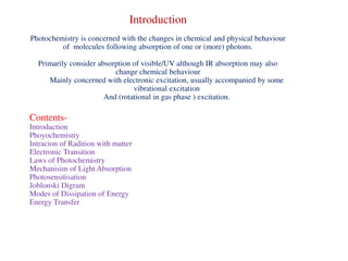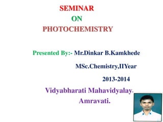 This document summarizes a seminar on photochemistry presented by Mr. Dinkar B. Kamkhede. The seminar covered topics including the definition of photochemistry, laws of photochemistry, mechanisms of light absorption, electronic transitions, photosensitization, and the Jablonski diagram. It discussed how photochemical reactions are initiated by the absorption of light energy and explained concepts such as quantum yield. The seminar provided an overview of the key concepts and processes in photochemistry.