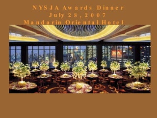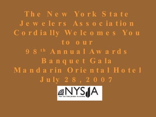 The document announces the 98th annual awards banquet of the New York State Jewelers Association to be held on July 28, 2007 at the Mandarin Oriental Hotel. It thanks generous sponsors who supported different sponsorship levels. It also lists nominees for favorite watch sales representatives, advertising sales representatives, and jewelry sales representatives. Finally, it recognizes past award winners from 2006 and provides contact information for the New York State Jewelers Association.