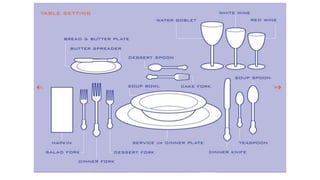 This document provides guidance on proper dining etiquette. It discusses various types of menus, how to make and handle reservations, seating procedures, napkin usage, starting and finishing a meal, table setting including placement of utensils and glassware, how to eat different foods like soup, bread, sandwiches and desserts, and placing utensils after completing a meal. The document emphasizes focusing attention on people rather than food and following etiquette rules around not talking with your mouth full or playing with food.
