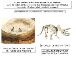 COM SABEM QUEELS DINOSAURES VAN EXISTIR? Avui dia podem conèixer l’aspecte dels dinosaures gràcies als FÒSSILS que els científics han trobat, estudiat i reconstruït. ELS CIENTÍFICS QUE ESTUDIEN ELS FÒSSILS S’ANOMENEN PALEONTÒLEGS ESQUELET DE TRICERATOPS PALEONTÒLEGS DESENTERRANT UN FÒSSIL DE DINOSAURE AVUI DIA ES PODEN VEURE DINOSAURES ALS MUSEUS