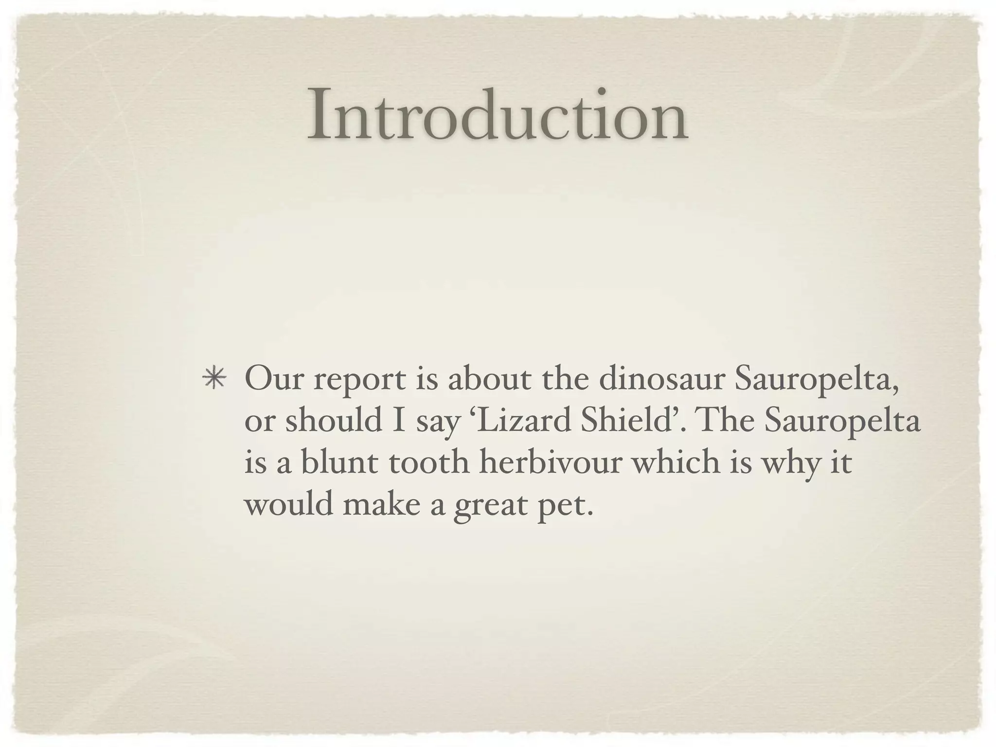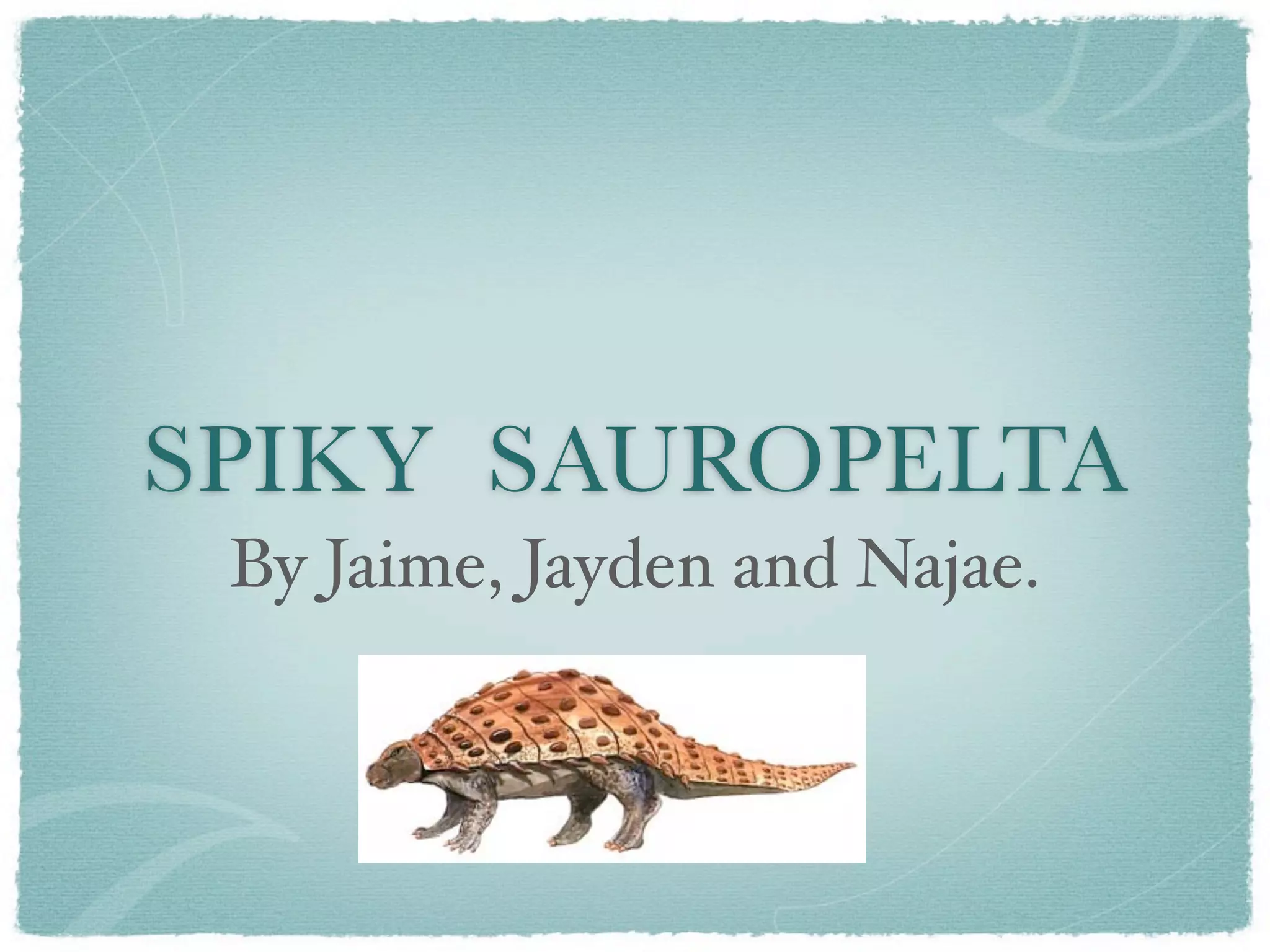 The document summarizes key details about the dinosaur Sauropelta. It was an 8-meter long, 3.5 ton herbivore covered head to tail in armor and spikes for protection. Though spiky in appearance, Sauropelta was actually friendly and meant no harm. It lived in shady forests in North America, ate giant prehistoric plants like one tree per day, and had medium intelligence, making it a suitable guard dinosaur.