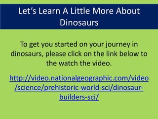 This document provides information about three different dinosaurs - Triceratops, Stegosaurus, and Tyrannosaurus rex. It includes facts about each dinosaur such as what they ate, how they defended themselves, and what their names mean. The document also contains interactive quiz questions about each dinosaur. The purpose is to educate about different types of dinosaurs from the Mesozoic era.