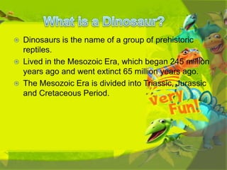 The document describes several different dinosaurs that lived during the Jurassic and Cretaceous periods. It discusses the small, green Compsognathus from the Jurassic period. It also talks about the largest carnivore, Tyrannosaurus rex from the Late Cretaceous period that could grow over 40 feet long. Additionally, it mentions the large herbivore Brachiosaurus from the Jurassic period that had an extremely long neck and tail. The document concludes by stating that dinosaurs went extinct around 65 million years ago at the end of the Cretaceous period during a time of high volcanic activity.