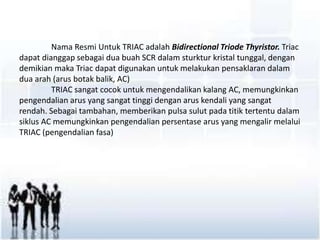 Triac, atau bidirectional triode thyristor, dapat berfungsi sebagai saklar dua arah untuk arus bolak-balik dan cocok untuk mengendalikan arus tinggi dengan arus kontrol rendah. Terdapat dua jenis triac, low-current dan medium-current, yang masing-masing memiliki batas arus dan tegangan tertentu. Pemilihan triac harus mempertimbangkan beberapa spesifikasi teknis, dan pengujian dapat dilakukan dengan ohmmeter untuk memastikan fungsionalitasnya.