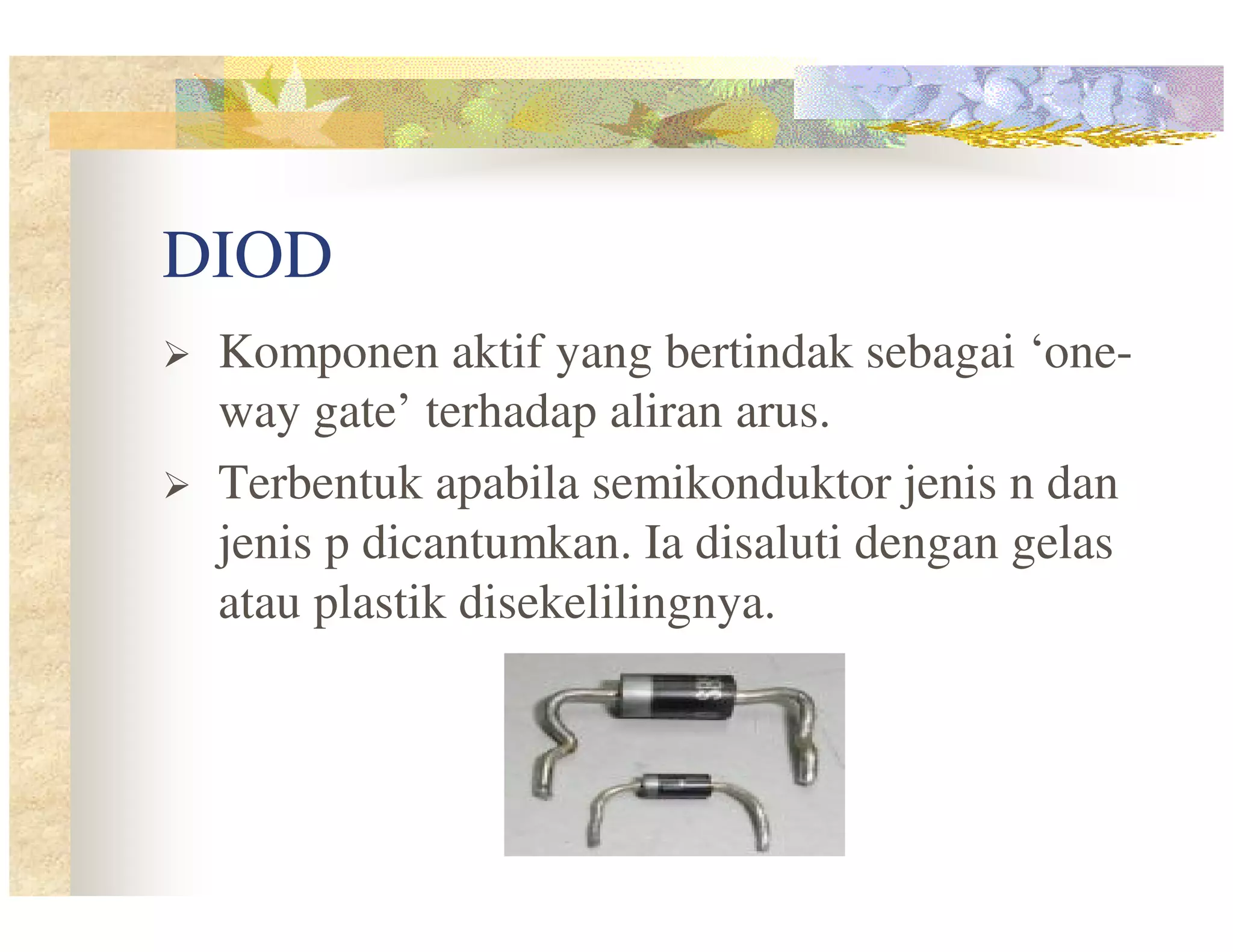 Dokumen ini menerangkan tentang fungsi dan struktur diod, yang merupakan komponen aktif yang membenarkan arus mengalir dalam satu arah sahaja. Terdapat dua jenis pincang iaitu pincang hadapan yang menunjukkan rintangan rendah dan membenarkan arus mengalir, serta pincang balikan yang menunjukkan rintangan tinggi dan menghentikan arus. Di samping itu, diod juga digunakan dalam pelbagai aplikasi seperti penukaran voltan AC kepada DC dan dalam rangkaian pengatur voltan serta pembolehubah warna dalam LED.