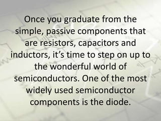 Diodes are semiconductor components that allow current to flow in only one direction. They have two terminals called the anode and cathode. Current can flow from the anode to the cathode but not in the reverse direction. When a forward bias is applied, the depletion region collapses and current can flow through the diode. When a reverse bias is applied, the depletion region expands and blocks current flow. Diodes are used in applications such as rectifiers, reverse current protection, logic gates, and voltage spike suppression.