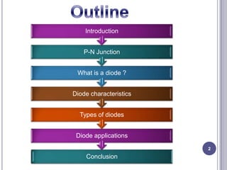 This document discusses diodes and their applications. It begins with an introduction to diodes, including what a diode is, the P-N junction, and diode characteristics when forward and reverse biased. It then covers types of diodes like LEDs, Zener diodes, and more. Applications discussed include logic gates, temperature measurement, and power conversion. The document focuses on rectifiers, explaining half-wave and full-wave rectification and how diodes are used to convert AC to DC in power supplies. Circuit diagrams are provided to illustrate the principles and components of half-wave and full-wave rectifiers, including the addition of a capacitor filter.