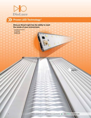 The document summarizes DioLuce's LED smart light assembly kits for retrofitting 2x2 and 2x4 fluorescent fixtures. The kits include LED panels, mounting brackets, and a power supply unit. They offer long life, high lumen output, energy savings over 50%, and easy installation under 5 minutes without rewiring. Motion sensors and dimming capabilities provide flexible light control. The kits are available in different voltage and color temperature options.