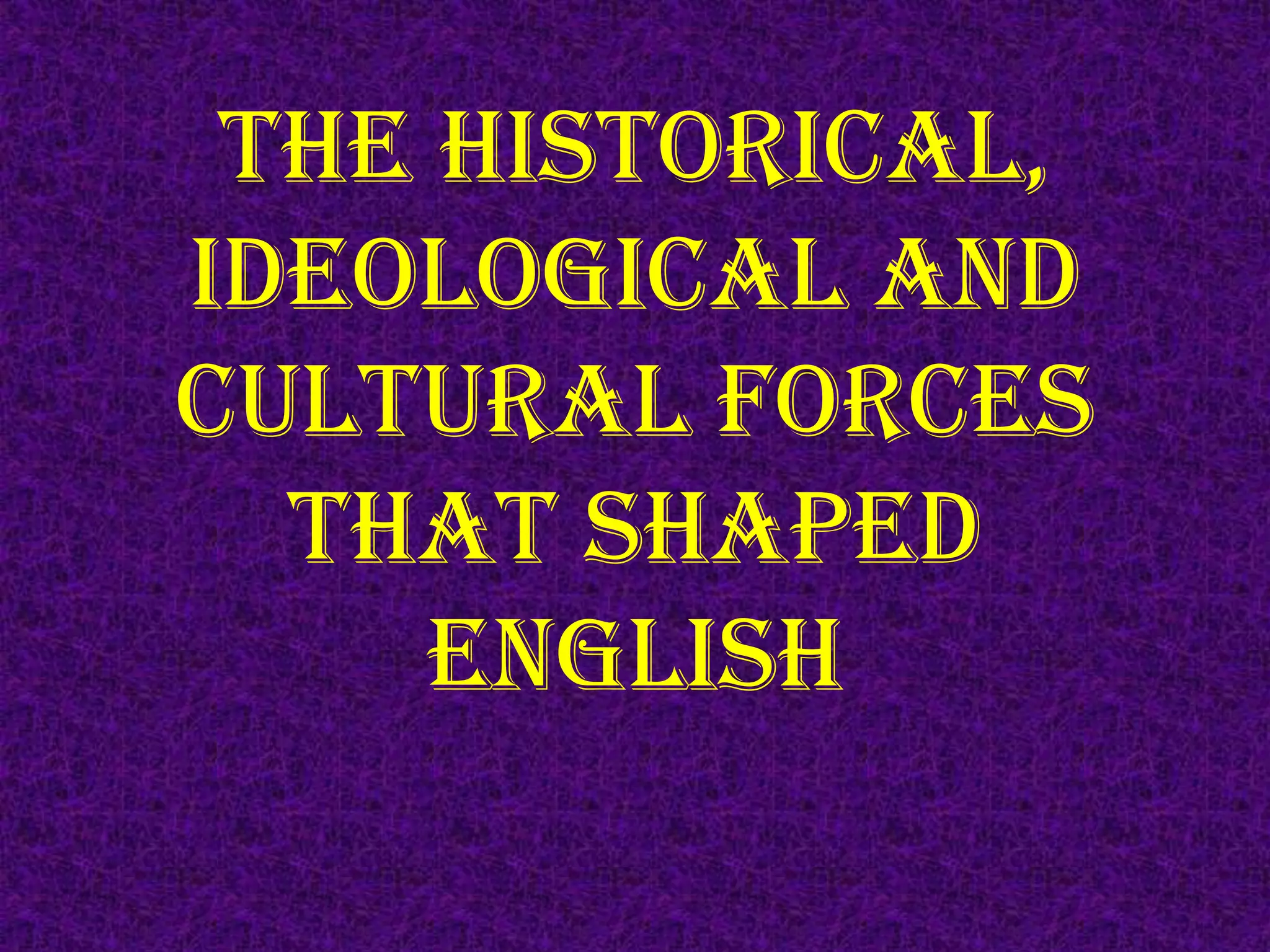 The document traces the historical forces that have shaped the English language from the Celts in 500BC to modern times. Key influences include the Romans who ruled Britain for over 400 years, introducing Latin words. Anglo-Saxons introduced Germanic dialects and one third of modern English vocabulary. Christian missionaries in 597AD and the Normans in 1066 introduced thousands of Latin and French words respectively. Explorers and traders in the Renaissance era introduced words from across the globe. The industrial revolution of the 18th-19th centuries spawned scientific and technological terminology. Today's English continues to absorb new words from technologies, foods and cultures around the world.