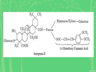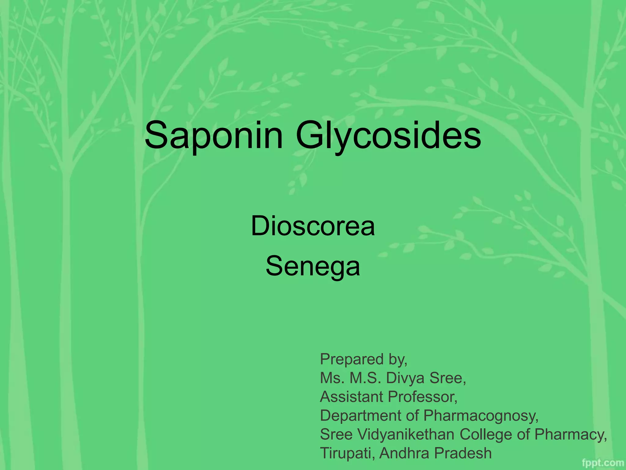 The document discusses the saponin glycosides of Dioscorea senega, detailing its biological source, cultivation methods, macroscopic and microscopic properties, chemical constituents, and uses. It highlights Dioscorea's rich content of diosgenin, which is utilized in pharmaceutical applications, while also addressing the characteristics of senega root from Polygala senega and its medicinal properties. Additionally, it mentions allied species and other preparations derived from these plants.