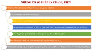 Tài liệu phân tích vụ kiện giữa các nạn nhân chất độc da cam/dioxin Việt Nam và các công ty hóa chất Mỹ, tập trung vào vấn đề thời hiệu khởi kiện và tư cách pháp lý của nguyên đơn. Các luật sư bên bị đã đưa ra nhiều lập luận về việc đơn kiện có thể đã hết thời hiệu, trong khi nguyên đơn khẳng định rằng không có thời hiệu áp dụng cho các tội ác chiến tranh. Vụ kiện đặt ra nhiều vấn đề pháp lý phức tạp liên quan đến trách nhiệm của các nhà thầu quốc phòng Mỹ trong chiến tranh Việt Nam.