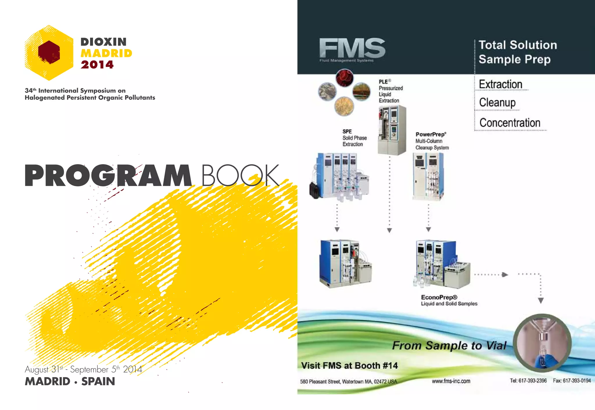 The document is a program book for the 34th International Symposium on Halogenated Persistent Organic Pollutants being held from August 31st to September 5th, 2014 in Madrid, Spain. The program book outlines the schedule of presentations, speakers, topics, and events during the symposium including plenary sessions, oral presentations, poster sessions, social events and tours.