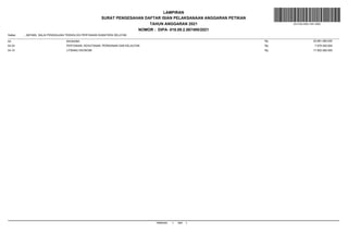 Dokumen ini merupakan surat pengesahan alokasi anggaran untuk Kementerian Pertanian, dengan total anggaran sebesar Rp 25.881.080.000 untuk tahun anggaran 2021, khususnya untuk Balai Pengkajian Teknologi Pertanian Sumatera Selatan. Anggaran tersebut akan digunakan untuk kegiatan penelitian dan pengembangan teknologi pertanian serta dukungan manajemen. Dokumen ini juga menjelaskan sumber dana, program, dan kegiatan yang terkait serta syarat dan ketentuan penggunaan anggaran.