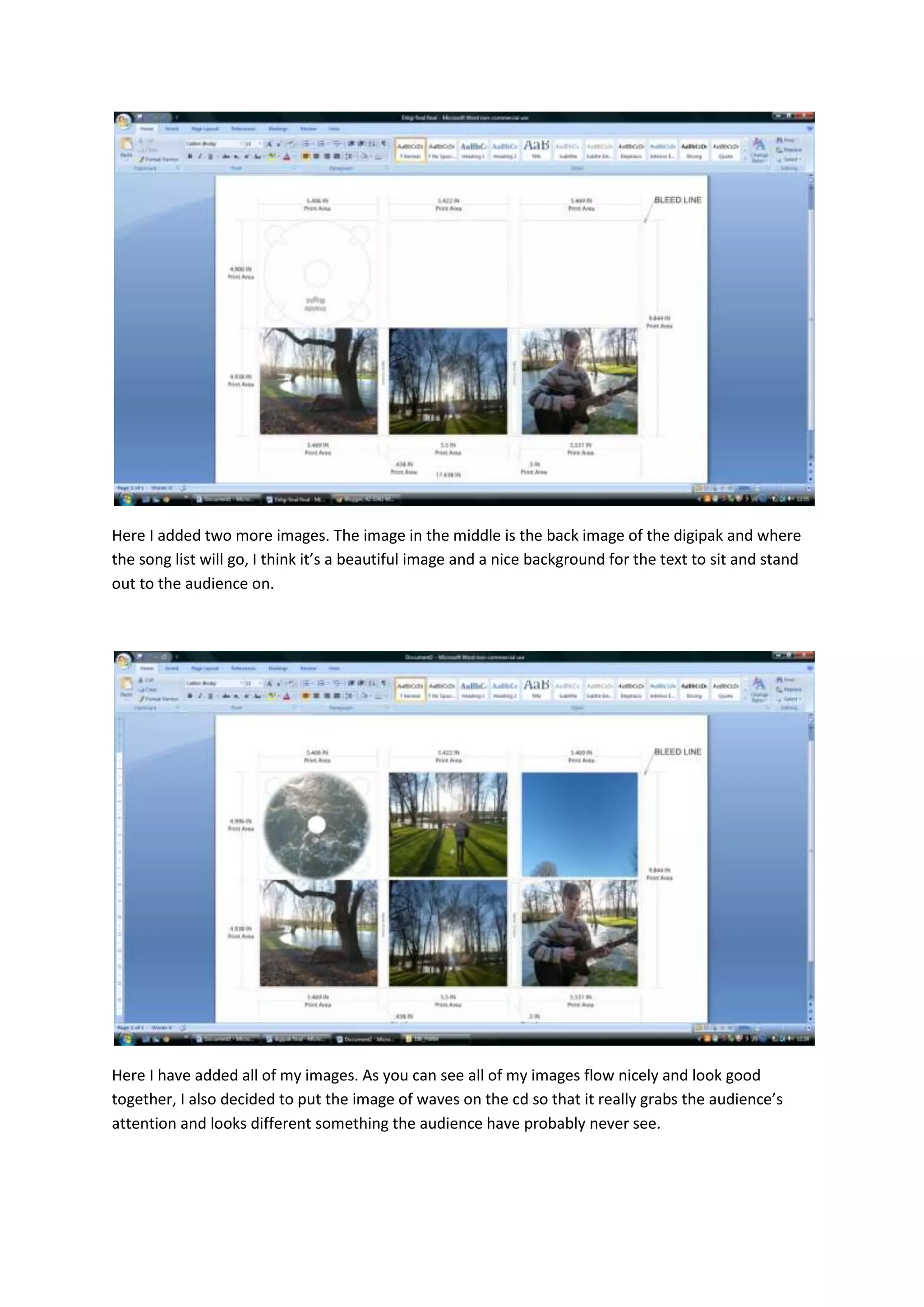 I chose Word to create my digipak because it was simple to use and allowed me to get the best results. The front cover features an image of the artist Conor that catches the audience's attention through eye contact. Another beautiful image was used on the back for the song list. All the images flow nicely together, and an image of waves was used on the CD to stand out. The same font used in the magazine ad was applied to the text to maintain consistency. The final product follows conventions of a folk/acoustic digipak and coordinates well with other promotional materials. After feedback, two images were changed to patterns representing other songs.