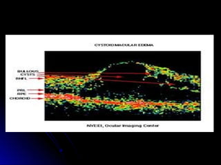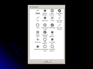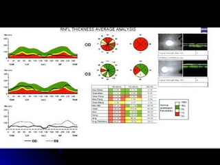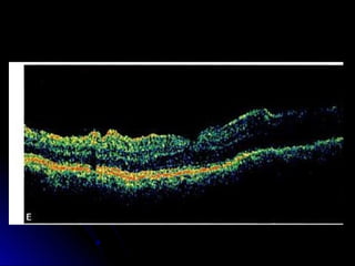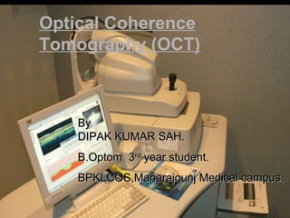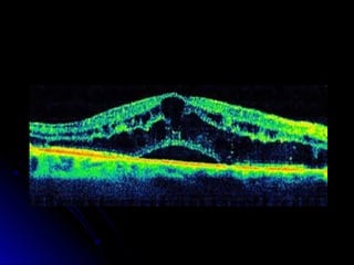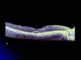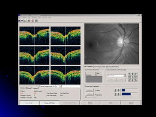 Optical coherence tomography (OCT) is a non-invasive imaging technique that examines living tissue using low coherence radiation. OCT allows for both qualitative and quantitative analysis of the retina. Qualitatively, OCT can describe retinal structures and anomalies. Quantitatively, OCT can measure retinal thickness and nerve fiber layer thickness. OCT works by capturing 128 to 768 axial scans in a single pass, with each scan containing 1024 data points over a 2mm depth. OCT has higher resolution and penetration depth than standard clinical imaging.