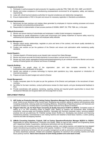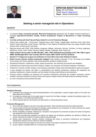 The document outlines the professional profile of Dipayan Bhattacharjee, a mechanical engineer with 11 years of experience in paper converting operations, currently serving as a Production Manager at Asia Pulp and Paper (India) Pvt. Ltd. His expertise includes production management, compliance, process improvements, and vendor management, with demonstrated skills in leading teams, improving efficiency, and project management. The document also details his work history, educational background, and various certifications, highlighting his leadership qualities and commitment to safety and continuous improvement.