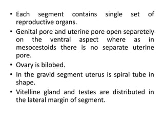 This document summarizes the morphology, life cycle, pathogenesis, treatment, and control of Diphyllobothrium latum, the fish tapeworm. It notes that D. latum has a scolex lacking hooks and suckers, with proglottids possessing a central rosette-shaped uterus. It can reach lengths of 2-12 meters with thousands of proglottids. Its life cycle involves eggs passing from the definitive host (dogs, cats, humans) and infecting copepods and fish as intermediate hosts. Humans can become infected by eating contaminated fish and may experience anemia. Treatment involves the drug praziquantel, while control focuses on proper fish handling and prevention of sewage contamination