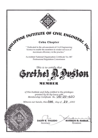 This document certifies that William B. Wilson has fulfilled the requirements for a Bachelor of Science in Civil Engineering from the University of Bohol. It was issued on December 13, 2002 and signed by the President and Chairman of the Board of Trustees of the University of Bohol. The document also certifies that William B. Wilson is a member of the Philippine Institute of Civil Engineers and is entitled to the privileges granted by its by-laws.