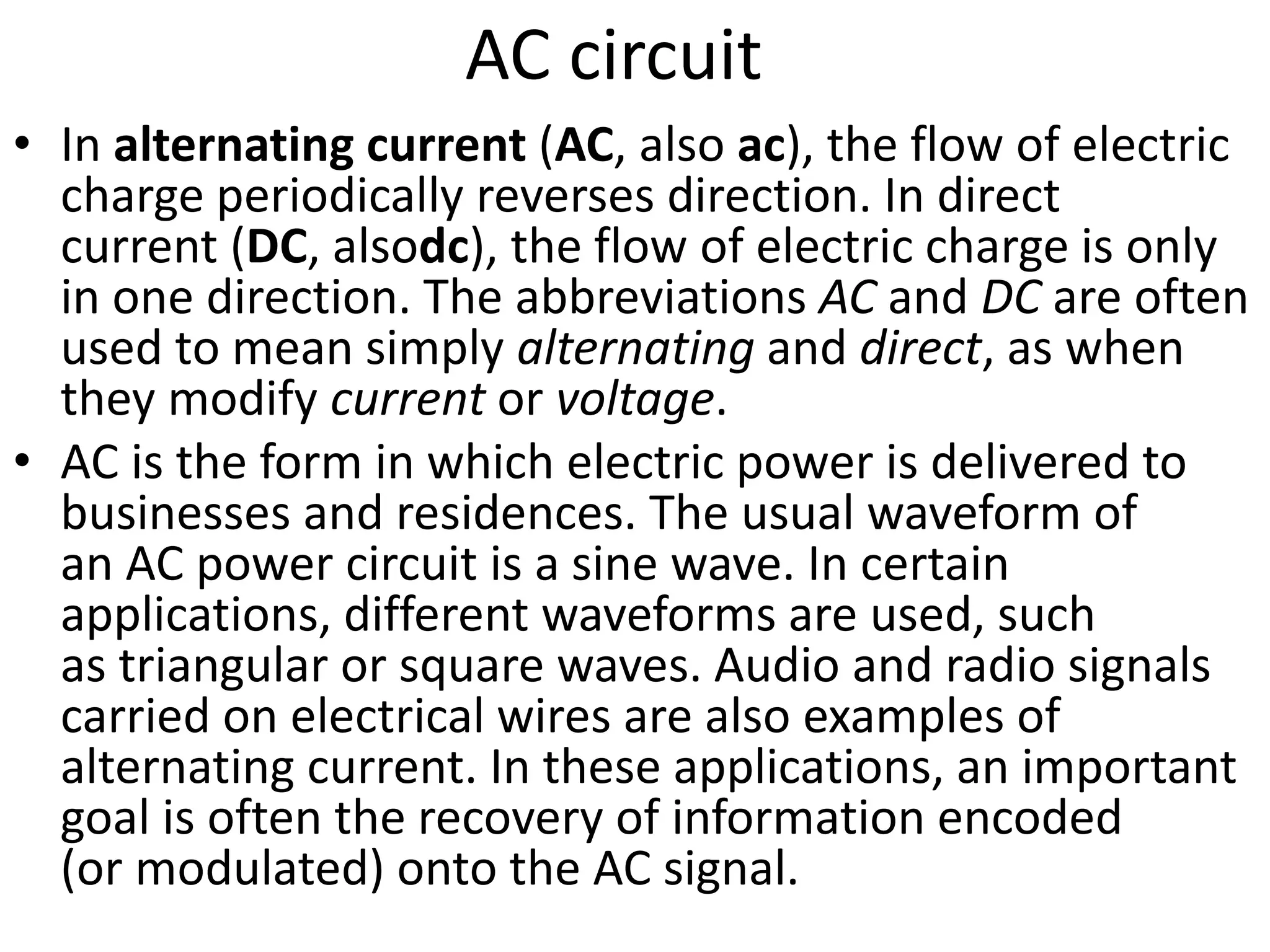 1) AC current periodically reverses direction while DC flows in one direction. AC power is delivered to homes and businesses as a sine wave.