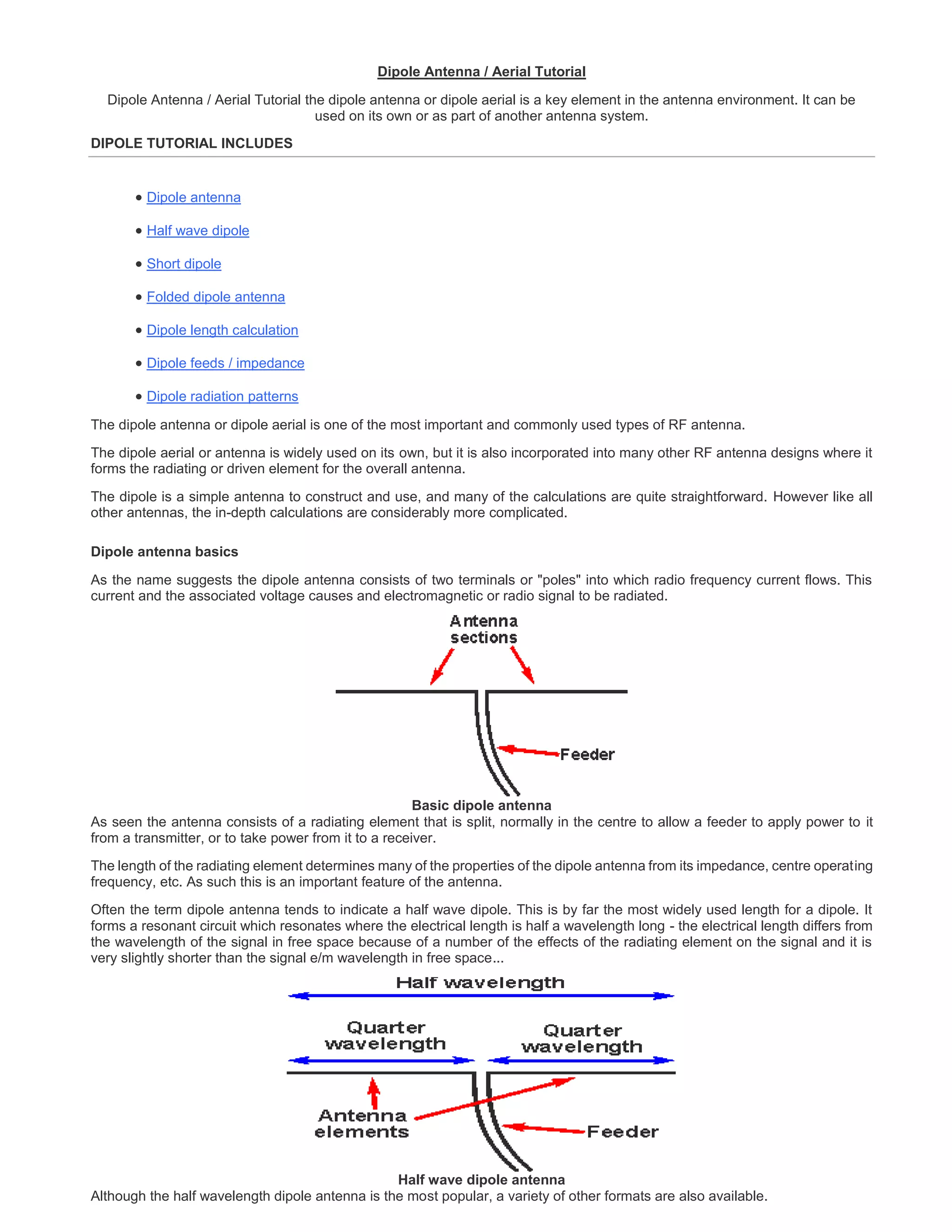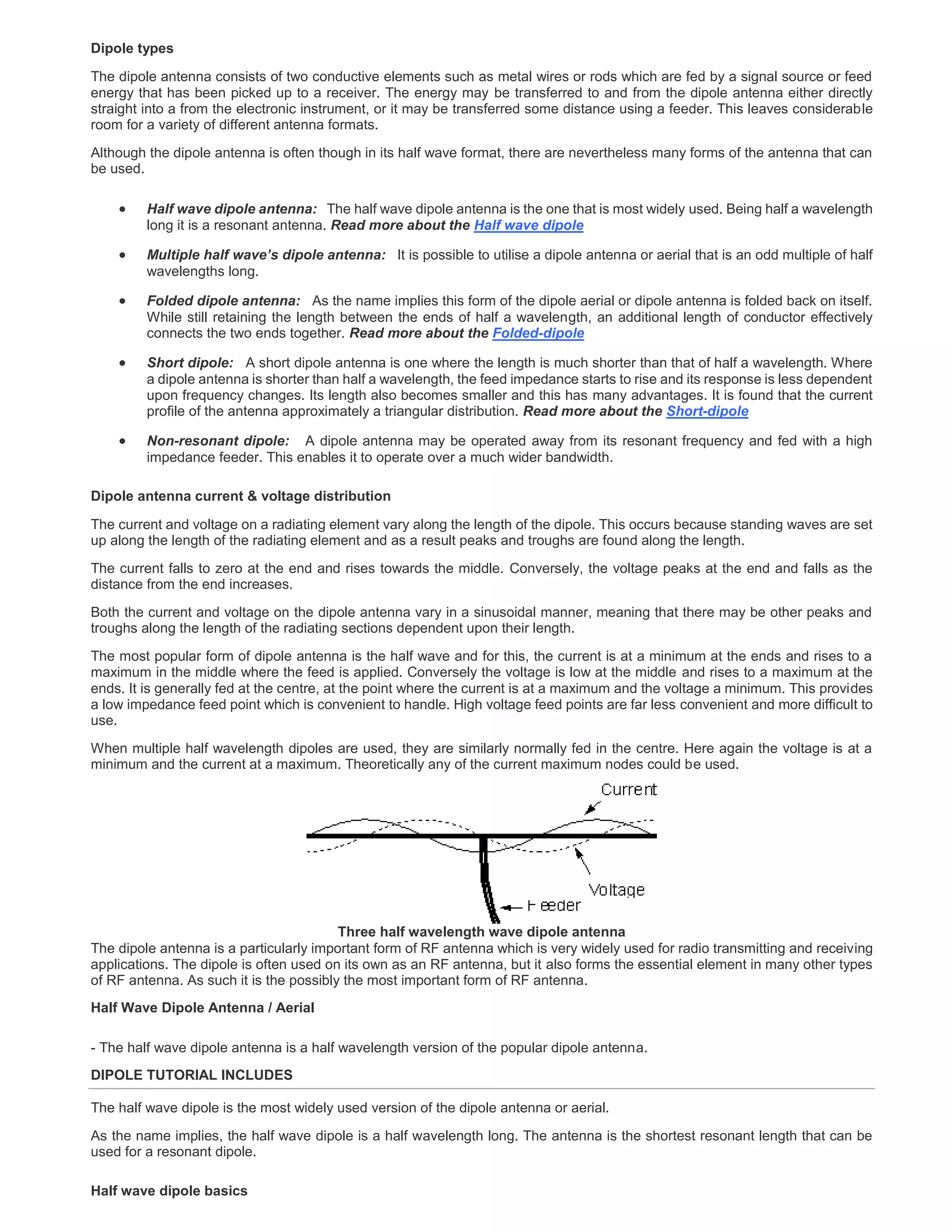 The document provides an extensive tutorial on dipole antennas, detailing various types including half wave, folded, and short dipoles. It outlines their construction, impedance characteristics, radiation patterns, and applications in RF systems, emphasizing the half wave dipole as the most commonly used format. Important concepts such as current and voltage distribution, feeding methods, and practical tips for installation are also covered.